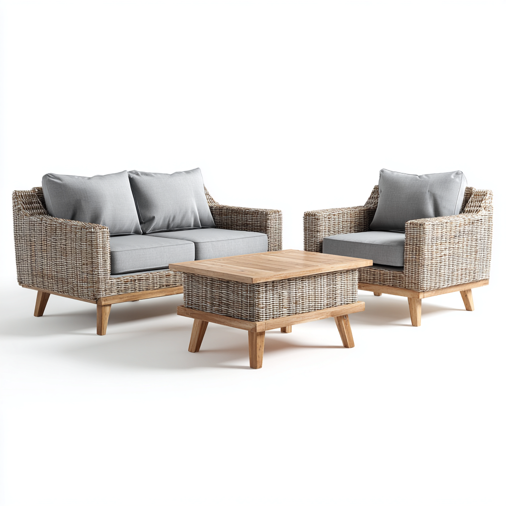 El sofá de dos plazas y el sillón individual proporcionan una estructura amplia y firme para sentarse. La mesa de centro ofrece un espacio estable para bebidas, accesorios o elementos decorativos, facilitando su uso en reuniones y momentos de descanso al aire libre.